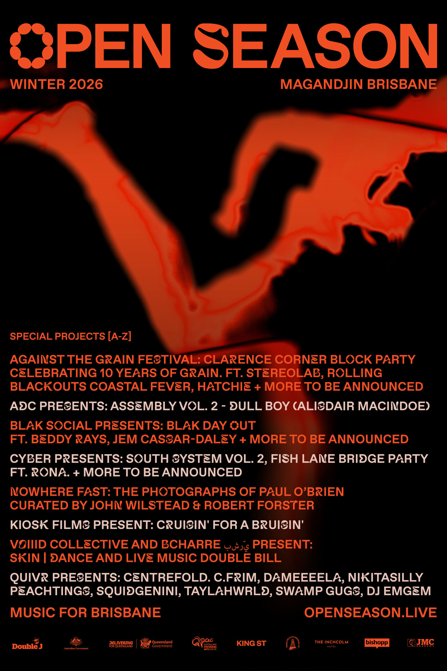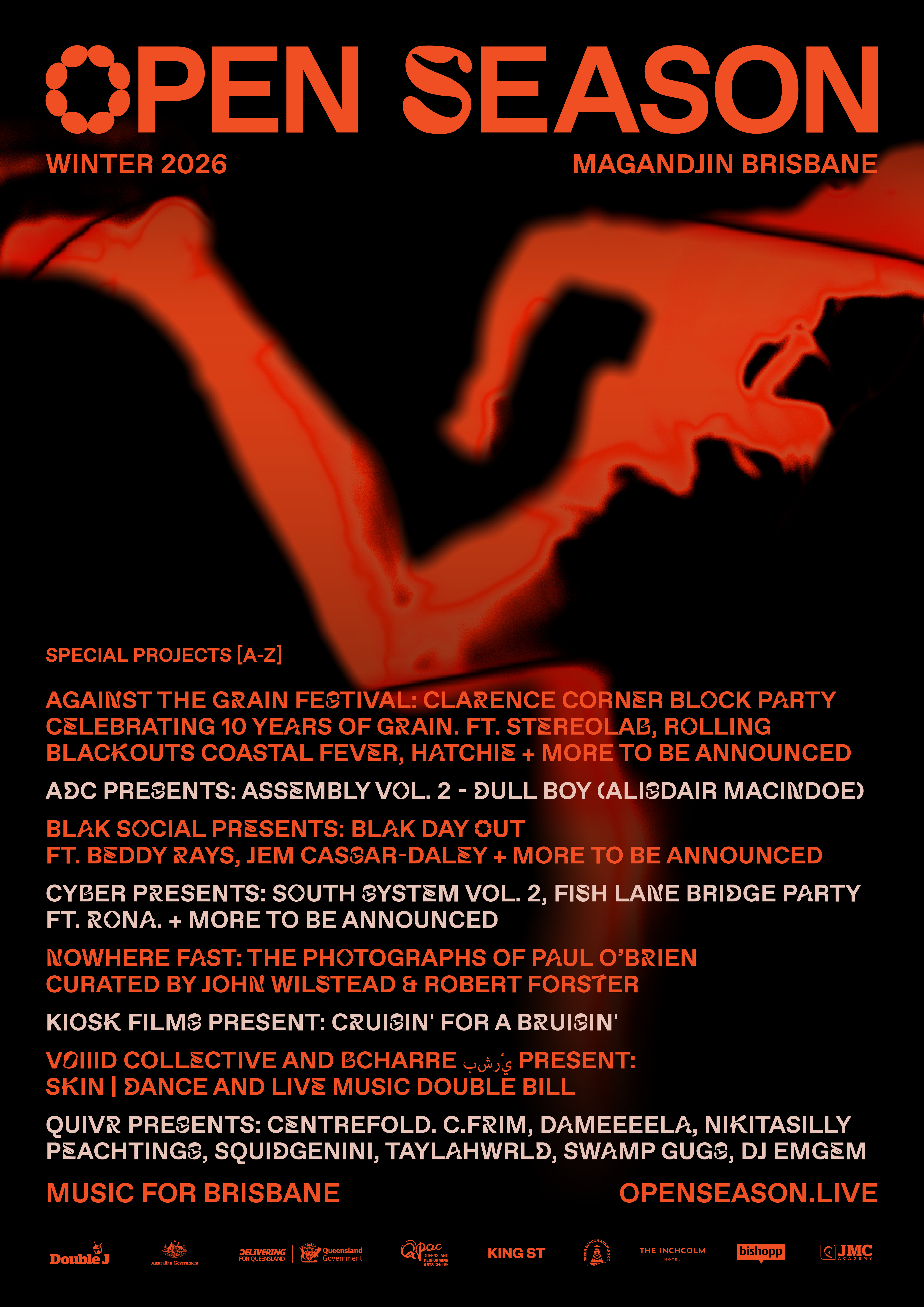 Creative Director Dave Sleswick describes this year’s program as Open Season at its most expansive yet "Open Season has always been about building something from the ground up, a program that belongs to the city and the people who live here. In 2026 we’re expanding further than ever: more venues, more artists, more unexpected spaces. It’s rough around the edges, full of bite and big ideas, and driven by people who genuinely care about making Brisbane a more interesting and culturally rich place to call home."